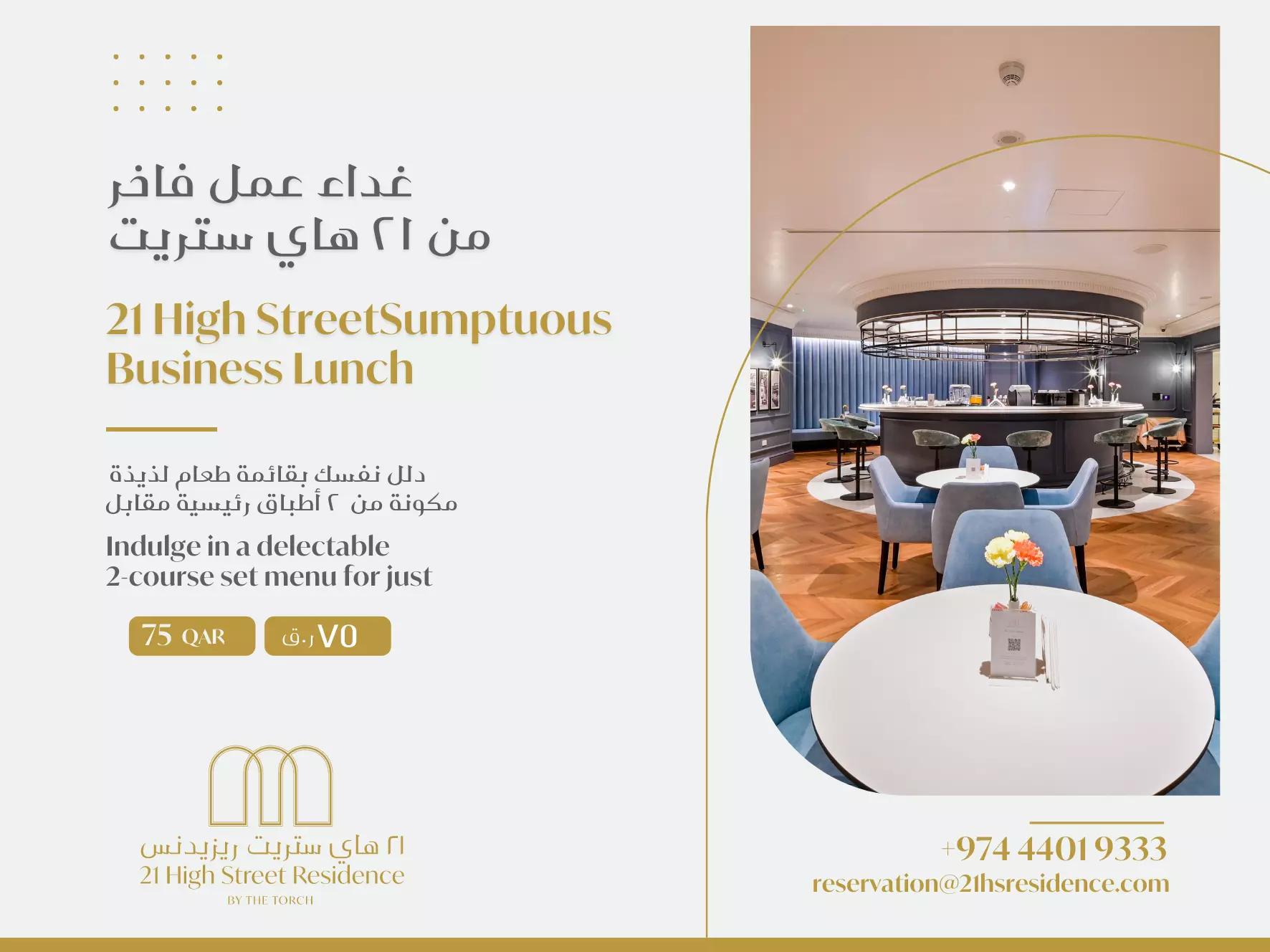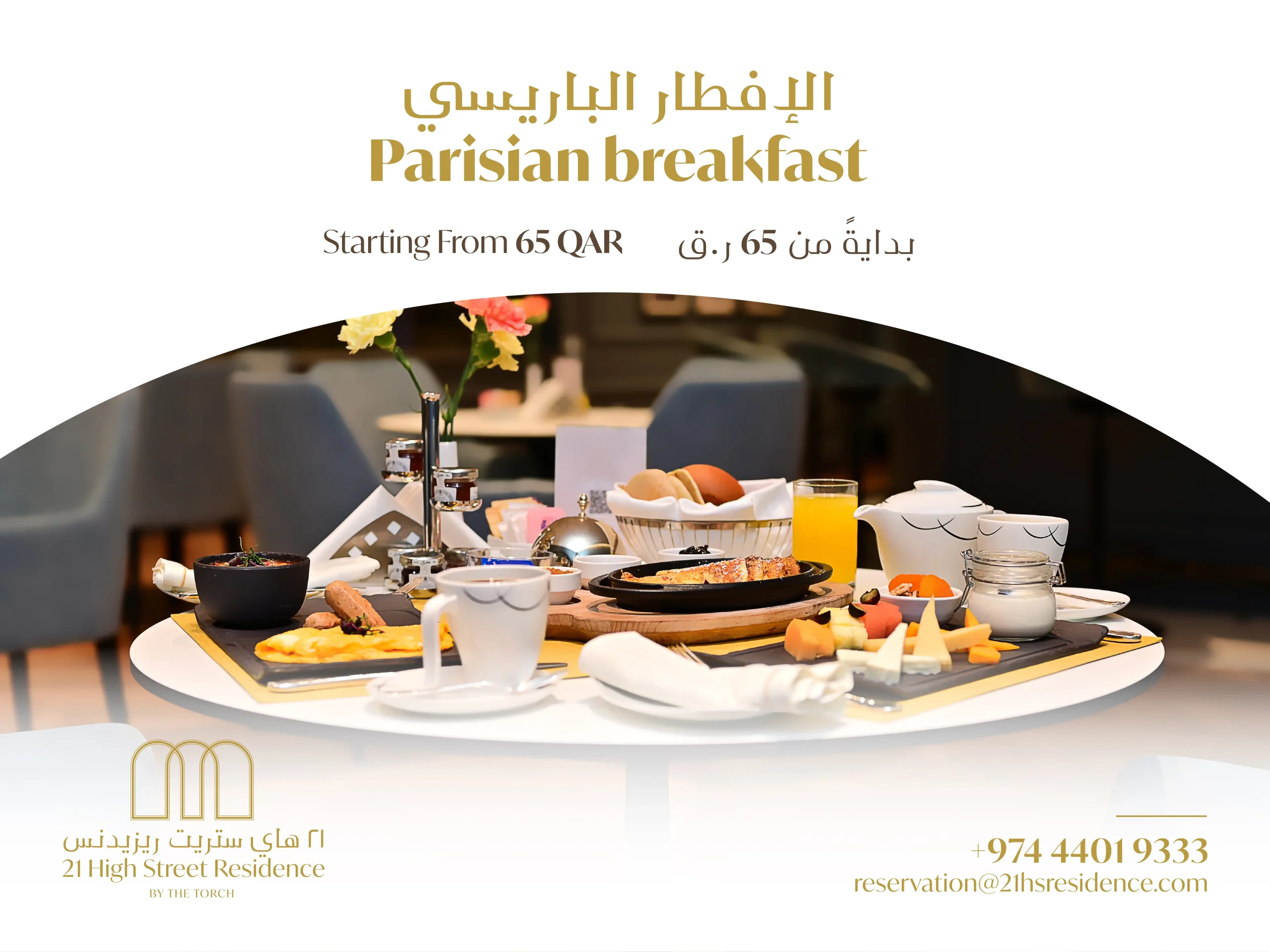 Offers SPECIAL OFFERS AT 21 High Street Residence Instagram Facebook Snapchat-ghost Twitter Tiktok 21 High Street Sumptuous Business Lunch Indulge in a delectable 2-course set menu for just 75 QAR Read More Enjoy Our Exclusive Summer Health Club Membership Rates Read More Parisian Breakfast Starting from 65 QAR Read More